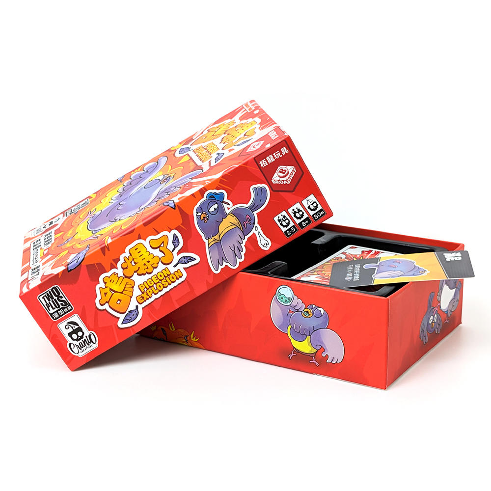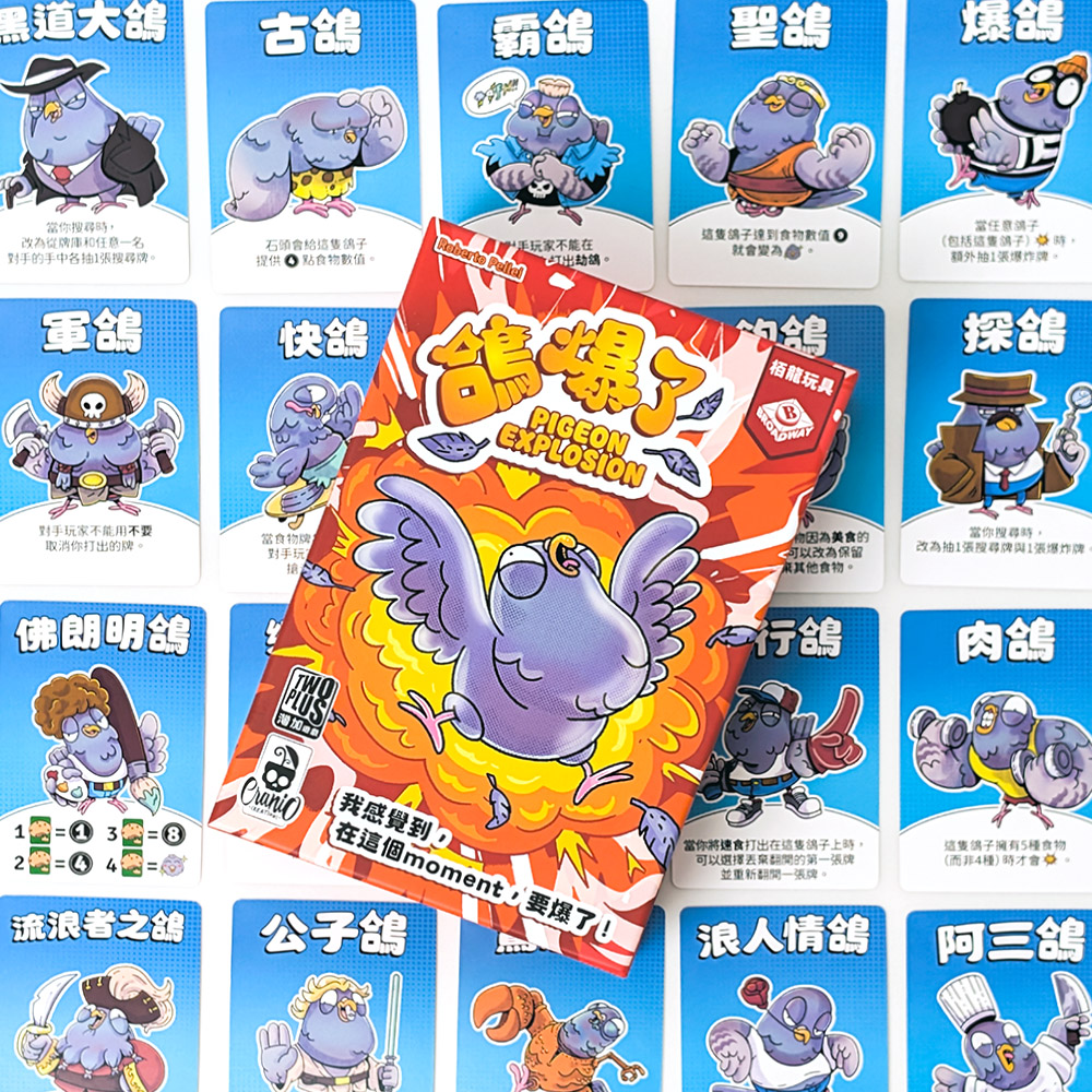 將快樂鴿子的食物全部丟棄,該玩家重新抽一張鴿子代表自己。 - 當任何一隻鴿子獲得的食物牌種類達到4種或更多,那隻鴿子就爆炸!將爆炸鴿子的食物全部丟棄,該玩家重新抽一張鴿子代表自己並額外抽2張爆炸牌,其他玩家抽1張。