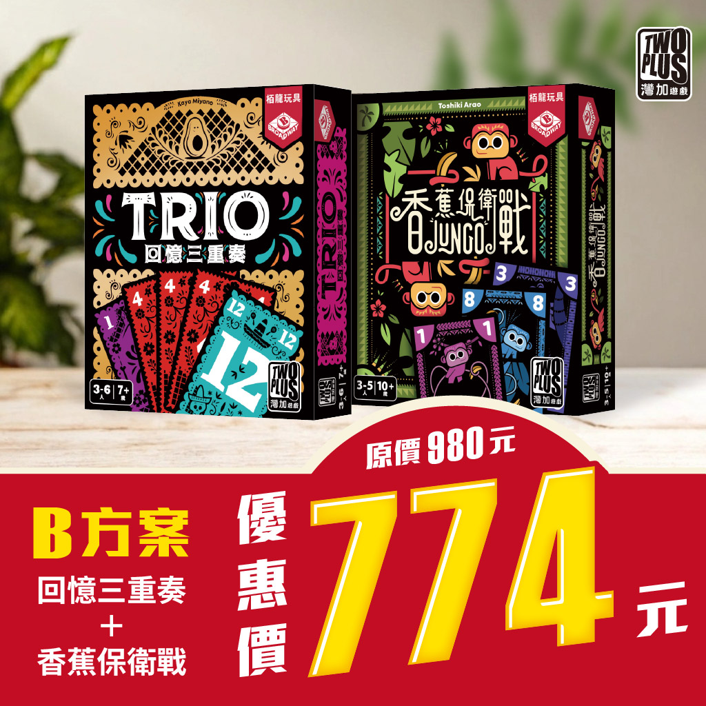 《回憶三重奏》考驗你的觀察與記憶,在翻牌間找回腦海深處的線索,拼湊屬於你的三重奏組合!簡單規則卻暗藏巧思,適合全家大小同樂。🐒《香蕉保衛戰》則帶來輕快又刺激的數字爭霸戰,猴群鬥智比大小,笑聲不斷、樂趣無窮!兩款遊戲一靜一動,完美融合思考與歡樂,無論親子時光還是好友聚會都最適合。現在 B 組合優惠價只要 774 元,快把雙重樂趣帶回家!